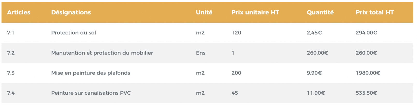 Dans le cadre de travaux, l’acheteur va décomposer le chantier par poste : installation de chantier, remise à niveau des sols, terrassement, pose de parquet…Voici un exemple de DPGF qui peut être produit :