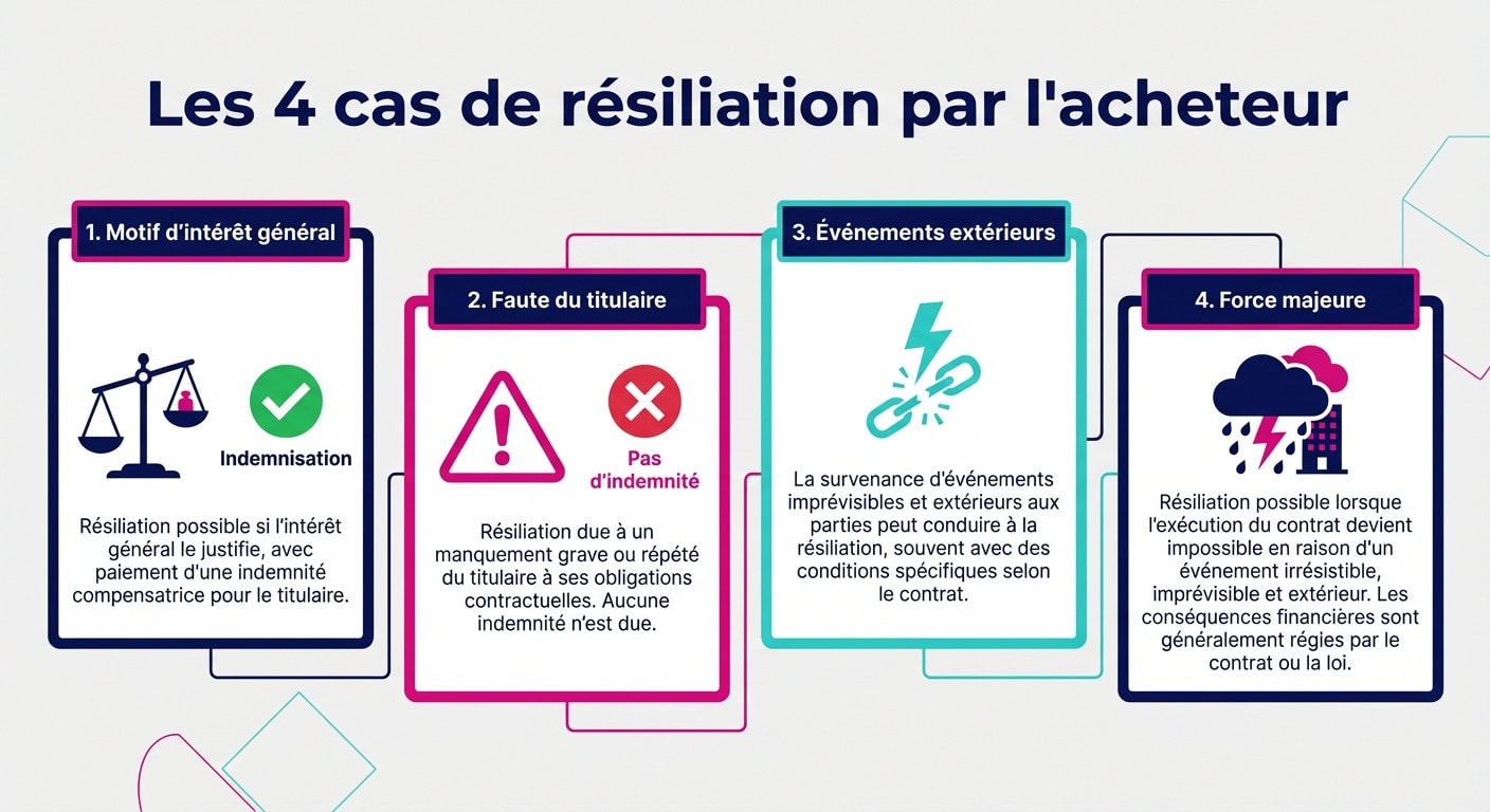 Dans cet article, nous allons décortiquer les 4 cas de résiliation à l’initiative de l’acheteur, les situations où vous pouvez vous-même demander la fin du marché, et surtout comment se déroule la liquidation financière. Vous découvrirez également les recours possibles si vous estimez que la résiliation est injustifiée 📋