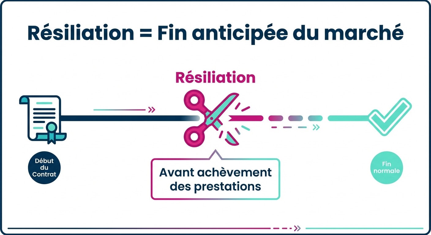 La résiliation est la fin anticipée d’un marché public avant l’achèvement complet des prestations prévues. Contrairement à la fin normale du contrat (après livraison et réception des travaux), la résiliation intervient en cours d’exécution. C’est une rupture du lien contractuel qui peut être initiée par l’acheteur ou, dans certains cas, par le titulaire.