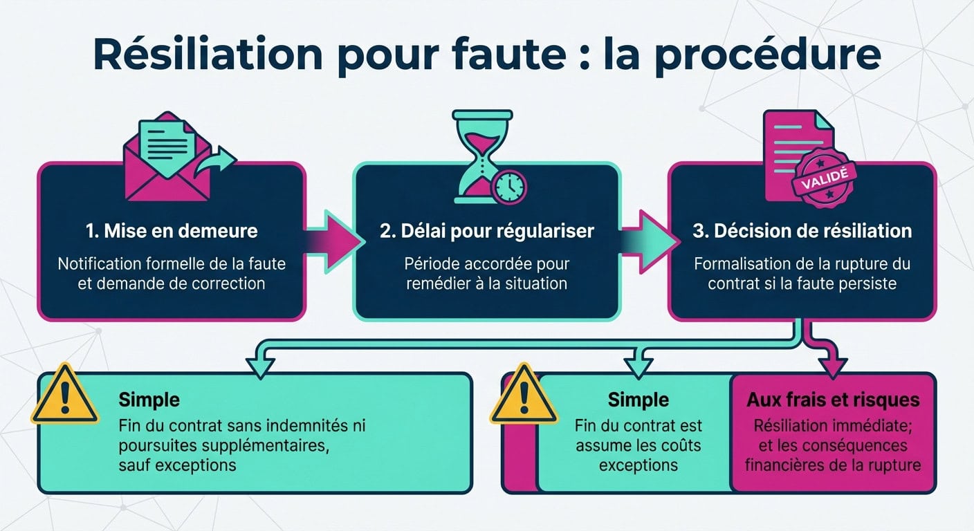 La résiliation pour faute est la sanction ultime en cas de mauvaise exécution. Elle peut avoir des conséquences lourdes sur votre entreprise, tant financièrement que pour votre réputation. Voyons ce qui vous attend concrètement.