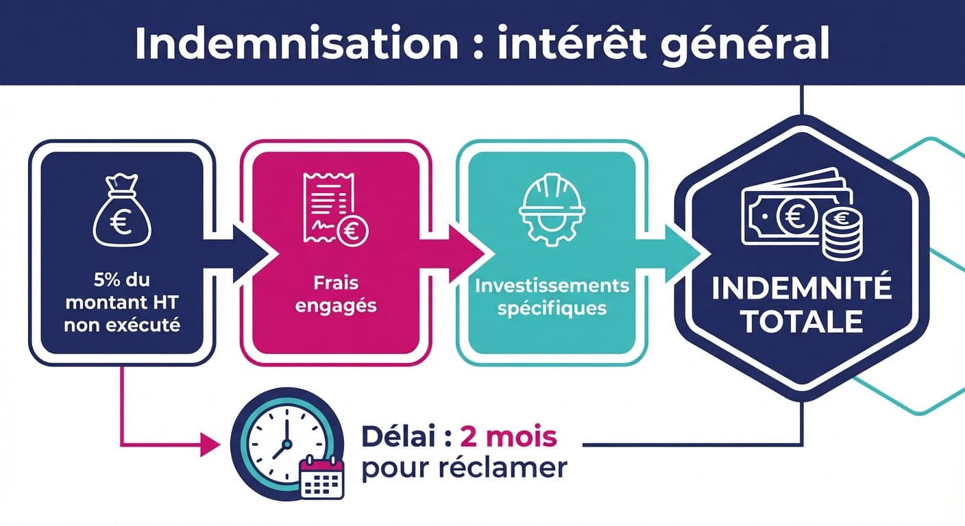 Puisque c’est le cas où vous êtes le mieux protégé, détaillons les modalités d’indemnisation. Quand l’acheteur résilie pour intérêt général, il reconnaît implicitement que vous n’avez commis aucune faute. En contrepartie, il doit vous indemniser intégralement du préjudice subi 🎯
