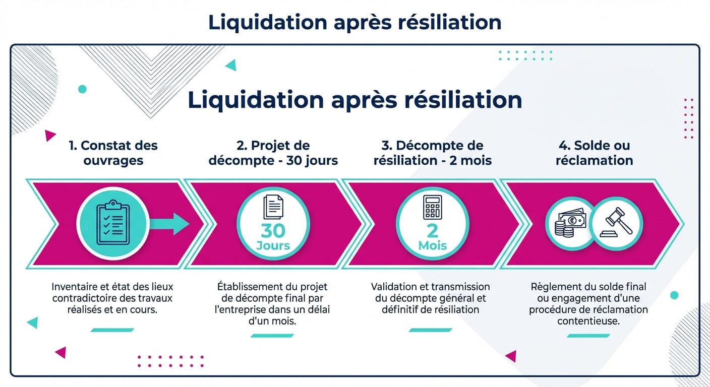 Contrairement au DGD qui intervient en fin normale de marché, la résiliation donne lieu à un décompte de résiliation. Ce document récapitule :