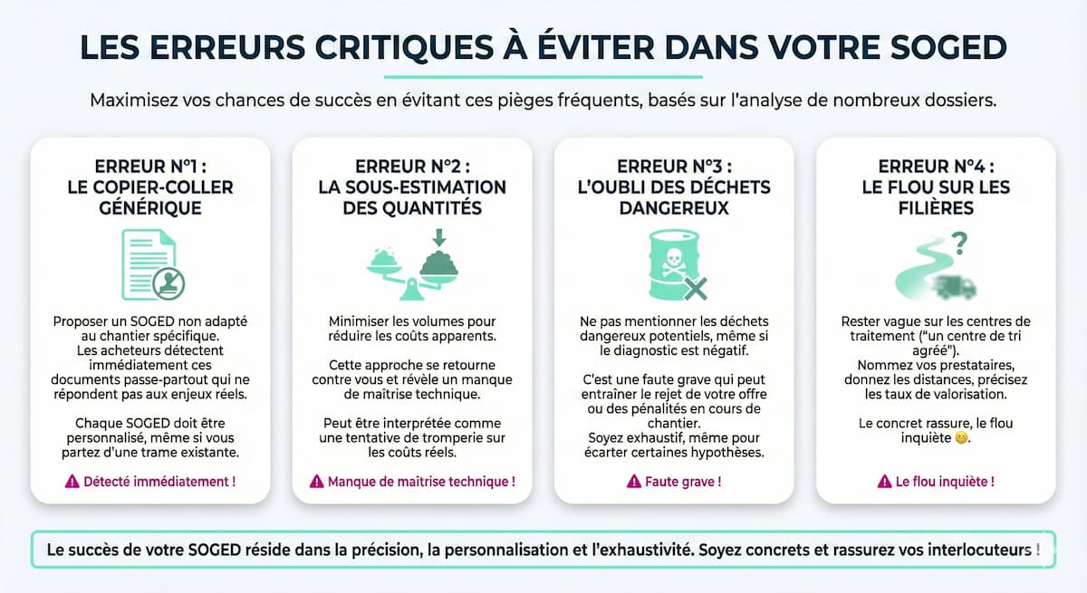 Après avoir analysé des dizaines de SOGED (et croyez-nous, on en a vu passer !), voici les erreurs les plus fréquentes. Évitez-les pour maximiser vos chances de succès :
