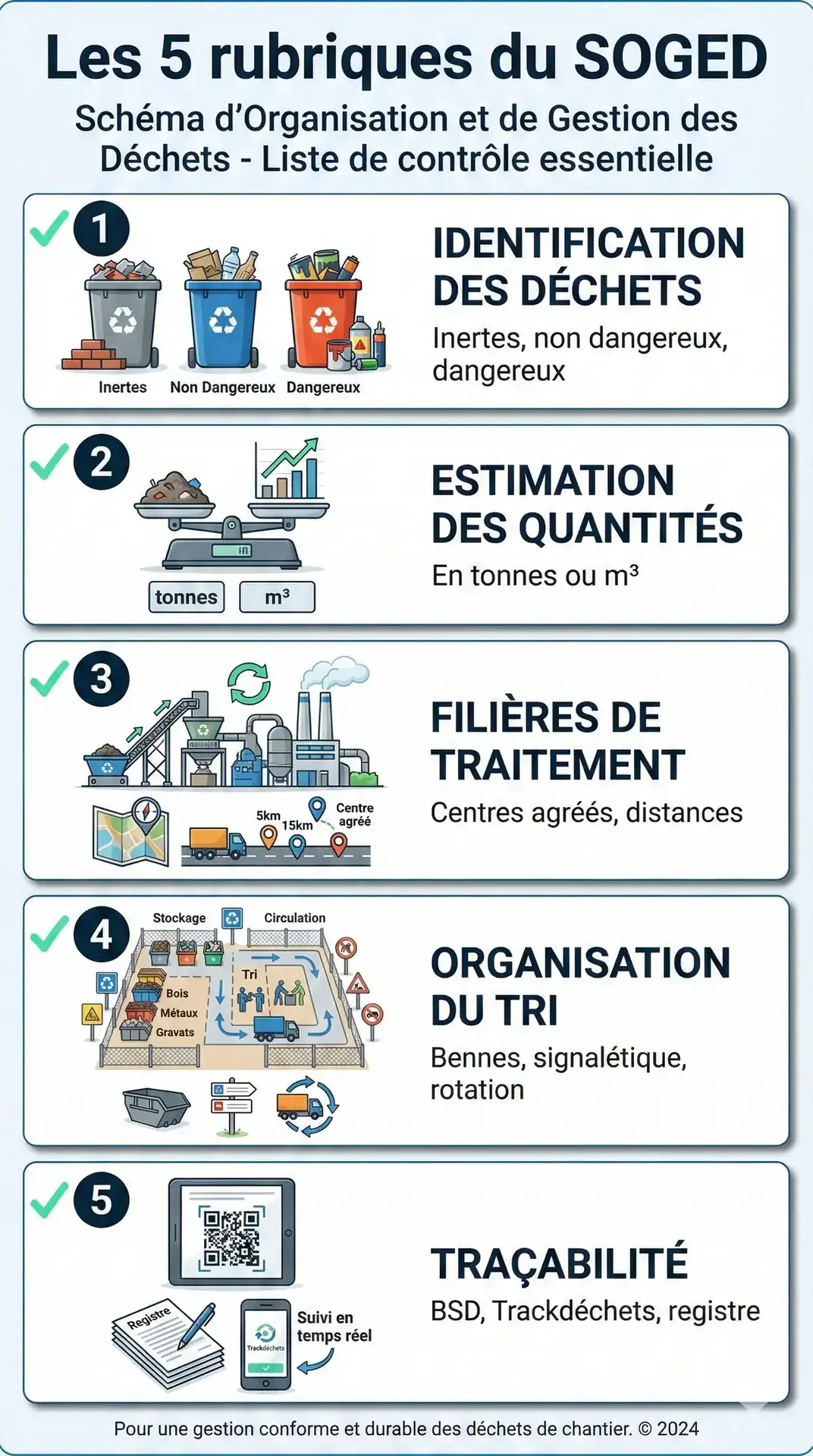 Cette obligation s’applique à toutes les entreprises du BTP, quelle que soit leur taille. En pratique, cela signifie que votre SOGED doit prévoir une organisation de tri permettant de séparer ces 7 catégories sur le chantier. C’est un changement majeur par rapport aux pratiques d’avant 2022 💡.